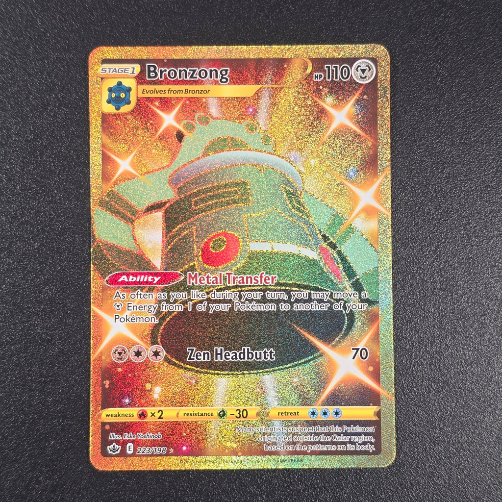 This is a beautiful Secret Rare Bronzong card from the Sword & Shield—Chilling Reign expansion, featuring a highly sought-after gold, full-art design and a useful ability for Metal-type decks.