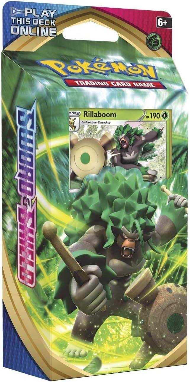 Unleash a thunderous rhythm with the Rillaboom Theme Deck from the Pokémon TCG: Sword & Shield expansion! This ready-to-play 60-card deck features the powerful Rillaboom, a master of percussive attacks, ready to drum up a winning strategy. With its evolutionary line, Thwackey and Grookey, and a supporting cast of Trainer and Energy cards, this deck is perfectly tuned to help you bash your way to victory. Get ready to feel the beat and lead your team to a triumphant finish!