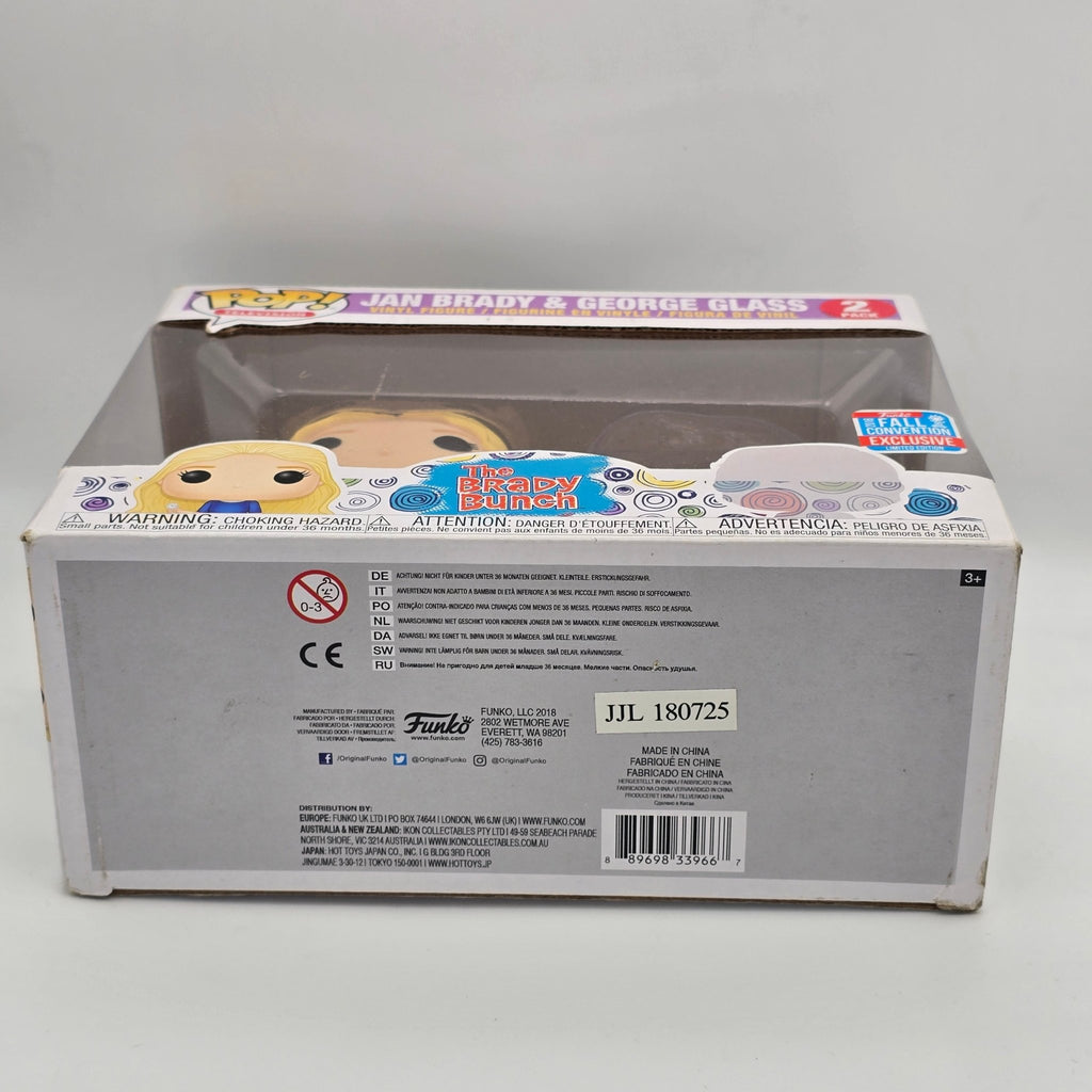 Marcia, Marcia, Marcia! But who cares when you have George Glass? Bring home one of the most iconic and humorous running gags in television history with this 2018 Convention Exclusive 2-Pack! This highly sought-after set features Jan Brady in her classic 70s attire alongside her completely imaginary boyfriend, George Glass, who is brilliantly rendered as a translucent, "invisible" Pop! figure. An essential, rare, and deeply nostalgic addition for any fan of The Brady Bunch!